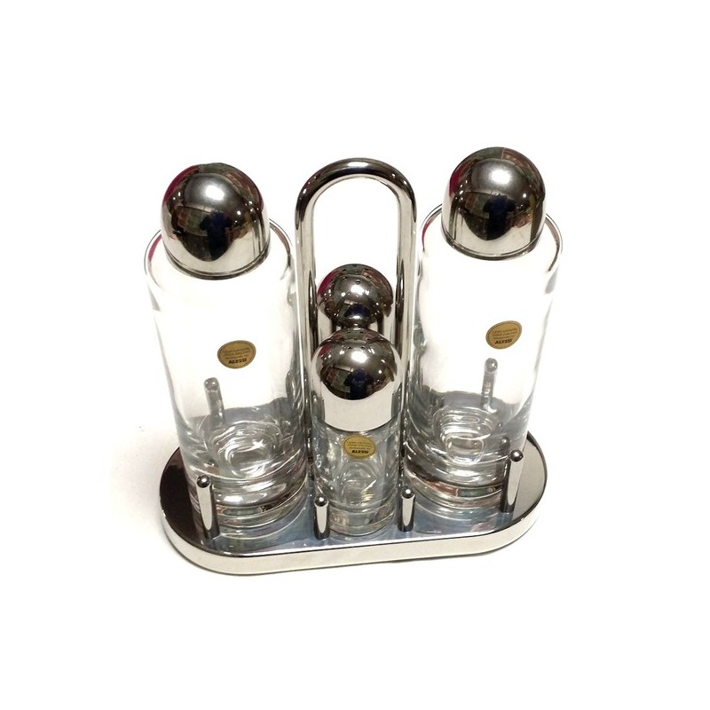 Servizio per olio aceto pape e sale in acciaio 18/10 lucido e vetro cristallino. La serie 5070 di ALESSI rimane una delle linee più famose e conosciute.